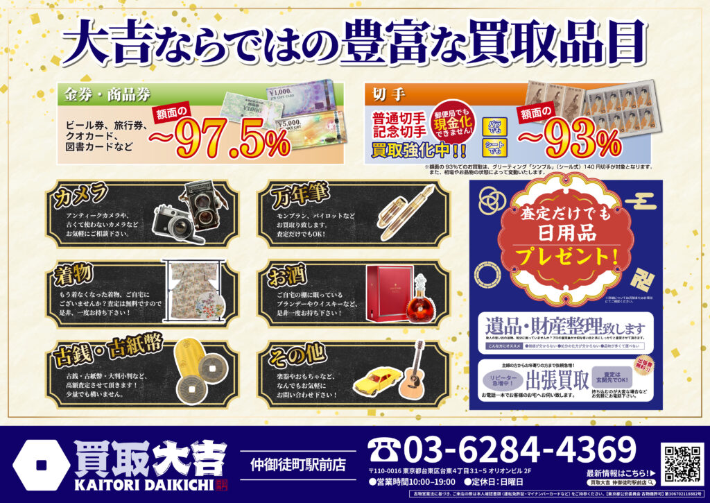 キャンペーン実施店舗 よくあるご質問 買取価格は主にどんな要素から決まるのでしょうか? お品物の状態や付属品の有無、最新相場、流通量などによって買取価格を算出します。 どんなものを買い取ってもらえますか? 金・貴金属・ブランド品はもちろん、お値段がつくか迷われているものも是非お持ちください。 傷や汚れのあるアイテムでも買取可能ですか? 大歓迎です。未使用品などのお持ち込みは少なく、傷や汚れのあるアイテムをお持ちいただく方が半数以上です。状態の悪いお品物やカビなどがあってもお買取可能なケースもございます。 どんな情報があればすぐに査定額を教えてもらえますか? お品物の名前や種類、状態、またはブランド名、型番などの情報があると、概ねの査定額をお伝えできるかと思います。 店舗での査定時間はどのくらいですか? お品物の種類や個数にもよりますが、約5分から30分ほどの査定時間となるケースが多いです。事前にある程度の査定時間をお伝えいたしますので、ご安心ください。